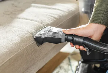 Once you have all the ‘extras’ off the couch, focus on the cushions. Technically, these can be taken off, and they should, but they can’t just be thrown in the washing machine. That’s where our vacuums will come in handy. Start by removing all pillows and blankets and use your vacuum’s attachments to clean hair and loose dirt from the surface. Our Pet Hair Eraser® Pet Vacuum is perfect for this. It has a mini rotating brush tool for places like your couch, because it’s small enough to fit into small spaces above the floor. It has spinning bristles that grip pet hair and other debris embedded on couch fabric and pulls them into your vacuum’s dirt tank. To use, attach the TurboBrush Tool to your vacuum’s hose, press gently down on the couch cushions and pull the brush toward you in a raking motion. Once you’re done getting the dry debris off the cushions, switch out your attachments for the crevice tool. Use this cleverly thin tool to get into those tricky spots, like between the couch where all those crumbs (and who knows what else) always fall.