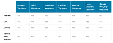 Like the table, you can reference this table to determine which vacuums work best for the types of messes you expect to encounter in your home.